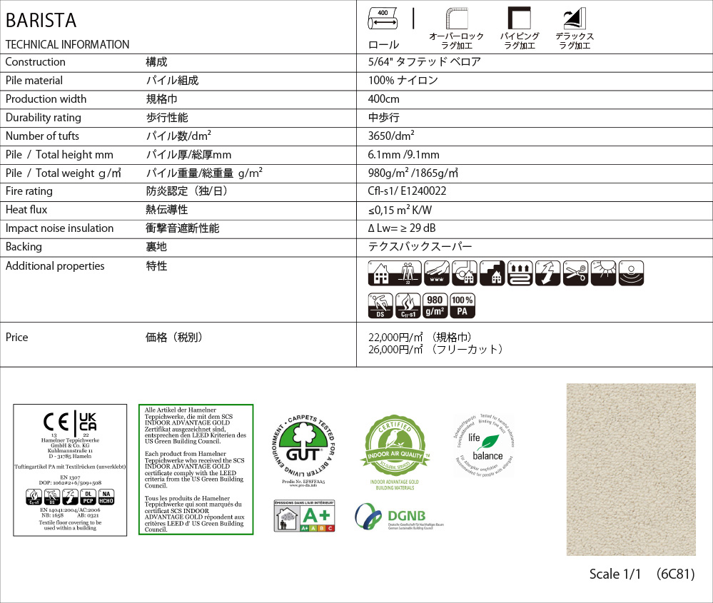 ※上記価格には、ドイツからの輸入経費が含まれますが、別途 輸入サーチャージ ¥3,000/㎡を申し受けます。
